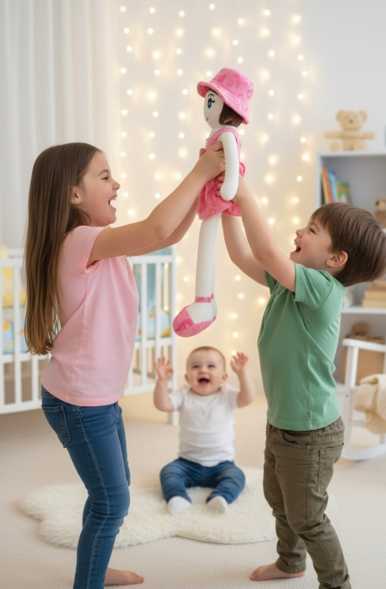 Meet Rosie Pink Doll by KiddyWiddy - eco-friendly, machine-washable, baby-safe soft toy that inspires imagination and comfort through play.